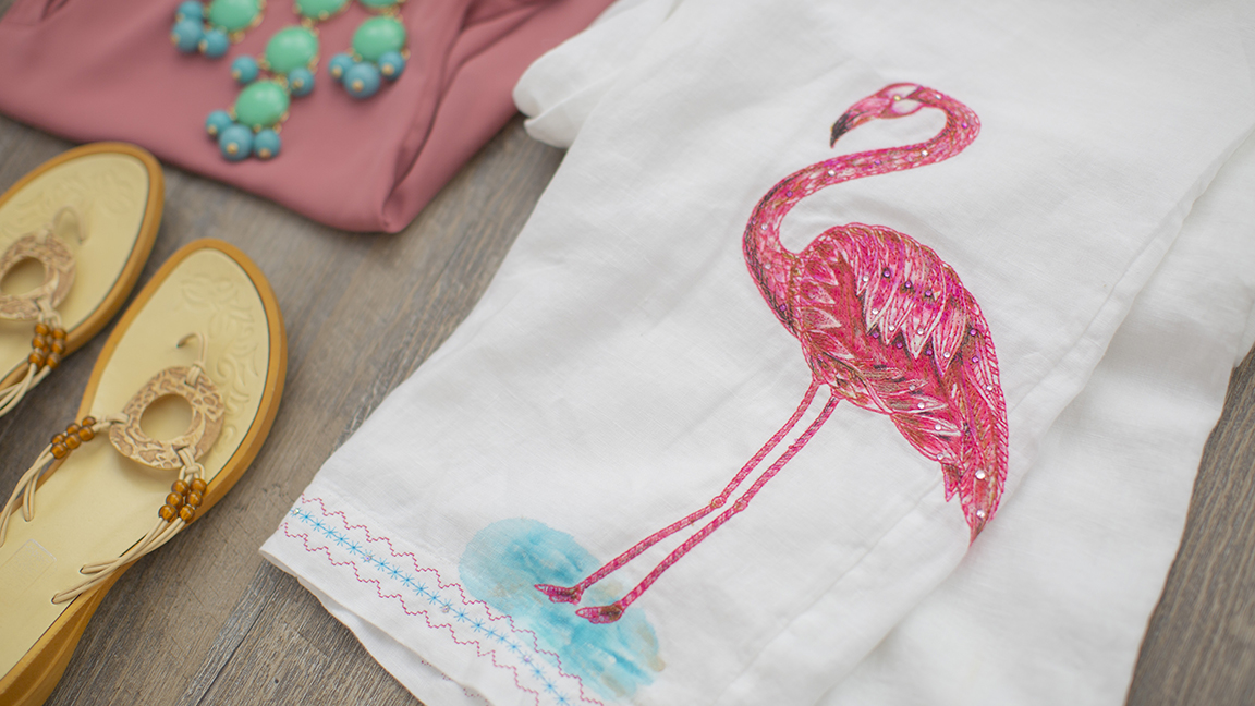 Dazzle your way to the beach or a tropical cruise with these beachy flamingo embroidered and embellished pants. Download printable instructions
