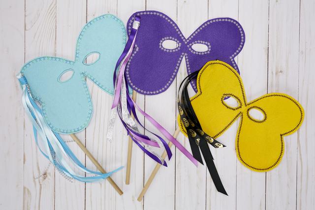 - If you would like a hand-held mask you can glue a 12” dowel on one side if you’d like a hands-free mask you can cut two 24” lengths of ribbon. If you choose the ribbon option hand-stitch one end of each ribbon to the back of the mask 1” in from the indent on each side of the mask.