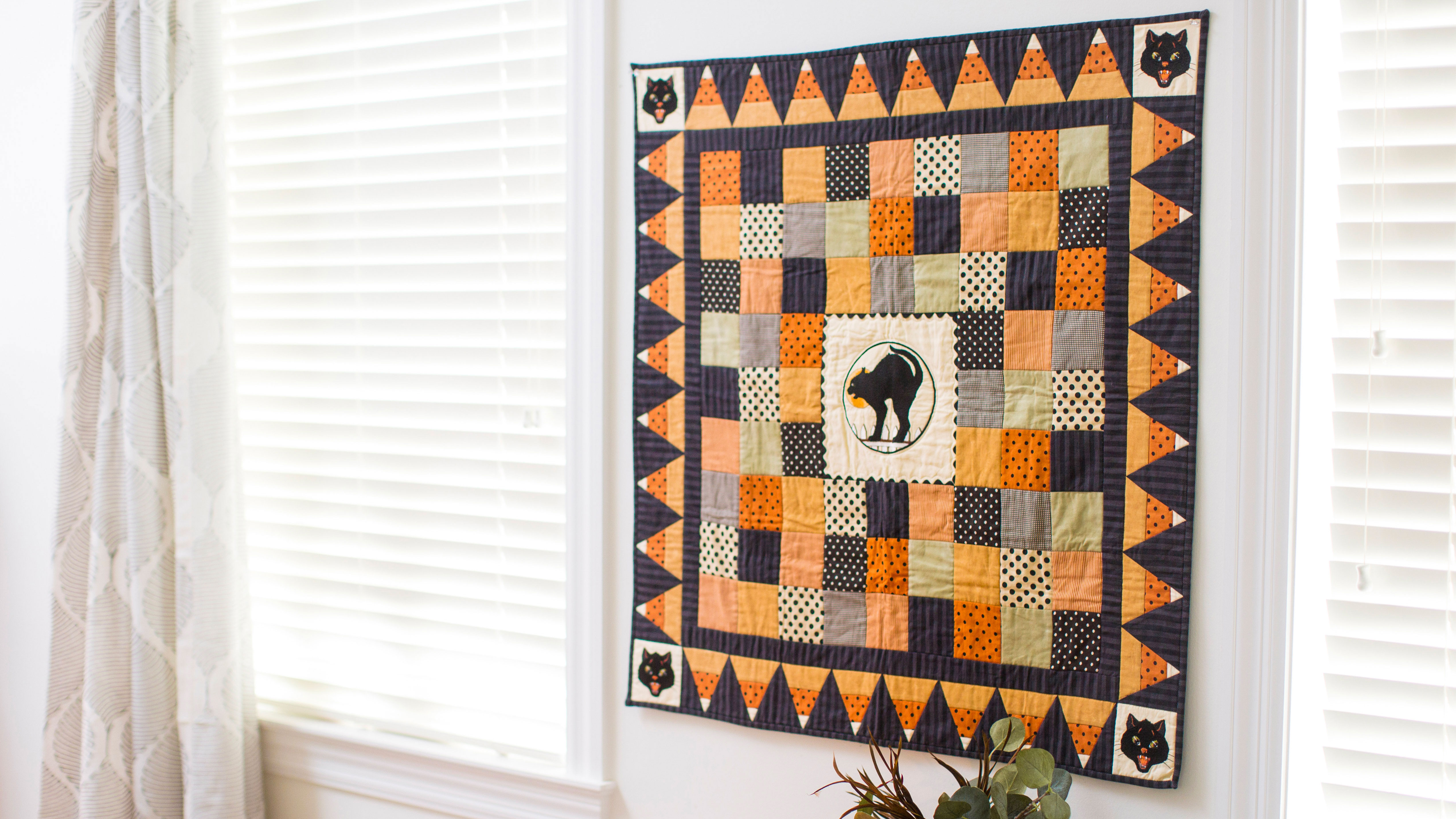 Spooky black cat embroidery sweet candy corn and fun funky polka dot fabrics stitched together make for the perfect Halloween quilt. This wall hanging will get your house into the Halloween spirit! Download templates and printable instructions.