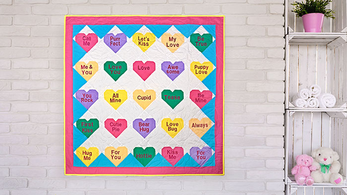 Create a fun candy dish quilt full of conversation hearts! These colorful heart-shaped pieced quilt blocks are reminiscent of the favorite Valentine's Day candy hearts and feature cute embroidered sayings. A perfect beginning quilting project to get your house cupid-ready this quilt is a fun way to bring a bright pop of color to your decor and a smile to your face! Click here to download instructions.