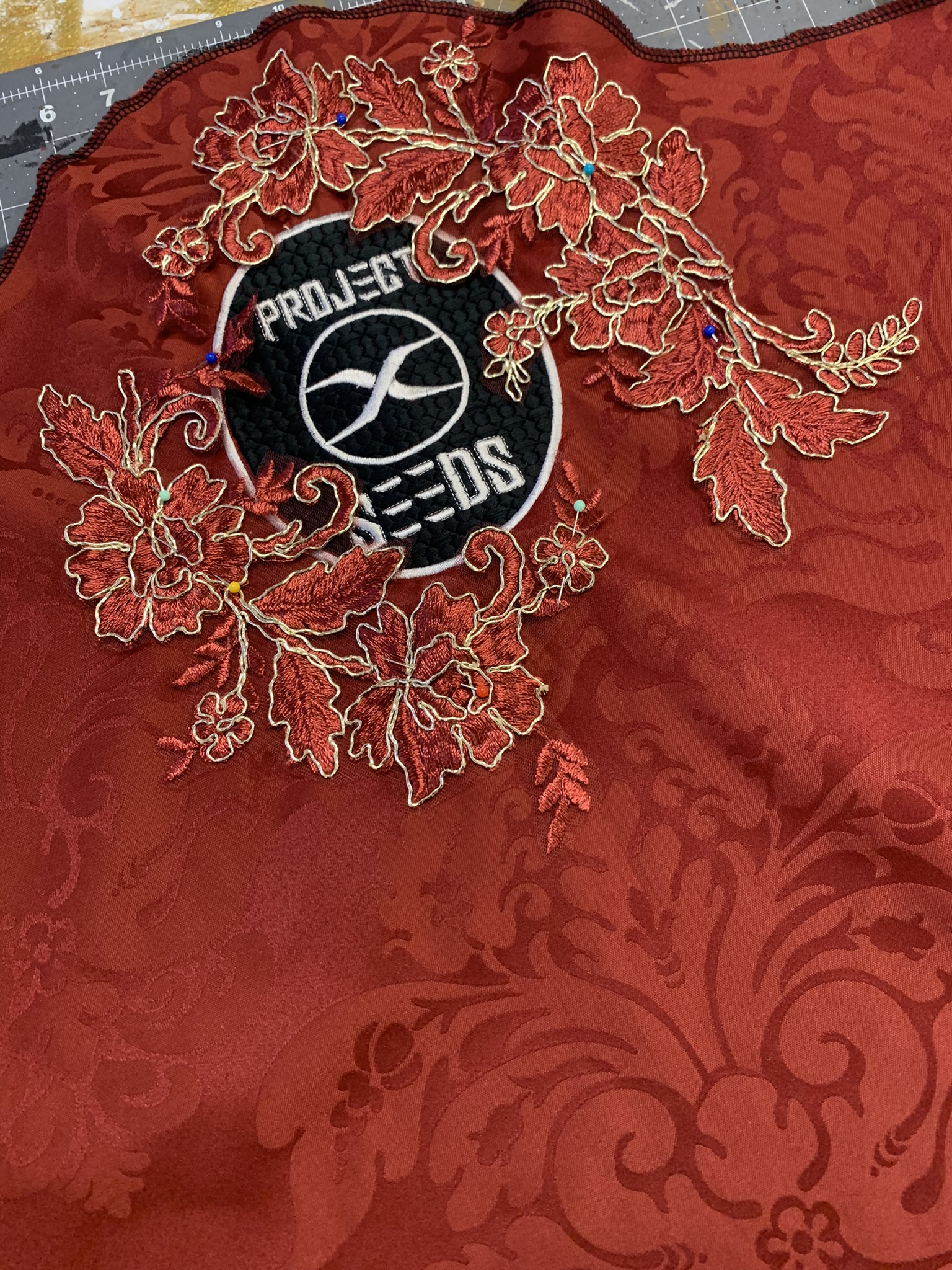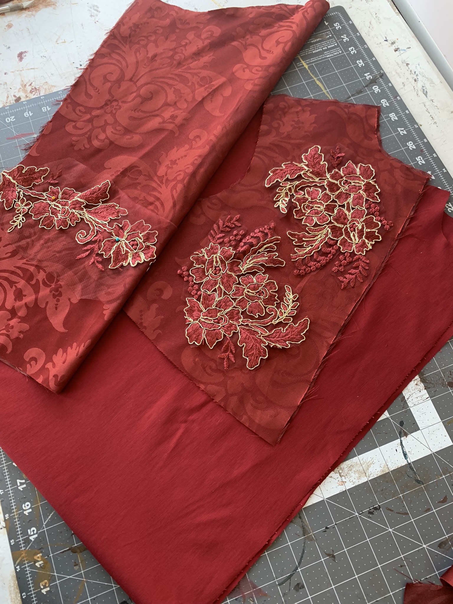I love to add lace, or incorporate fabrics with patterns and texture. Here’s what I had collected; A beautiful red and gold floral lace that I intend to overlay on this brocade. This references my character inspiration's love of geranium flowers.
