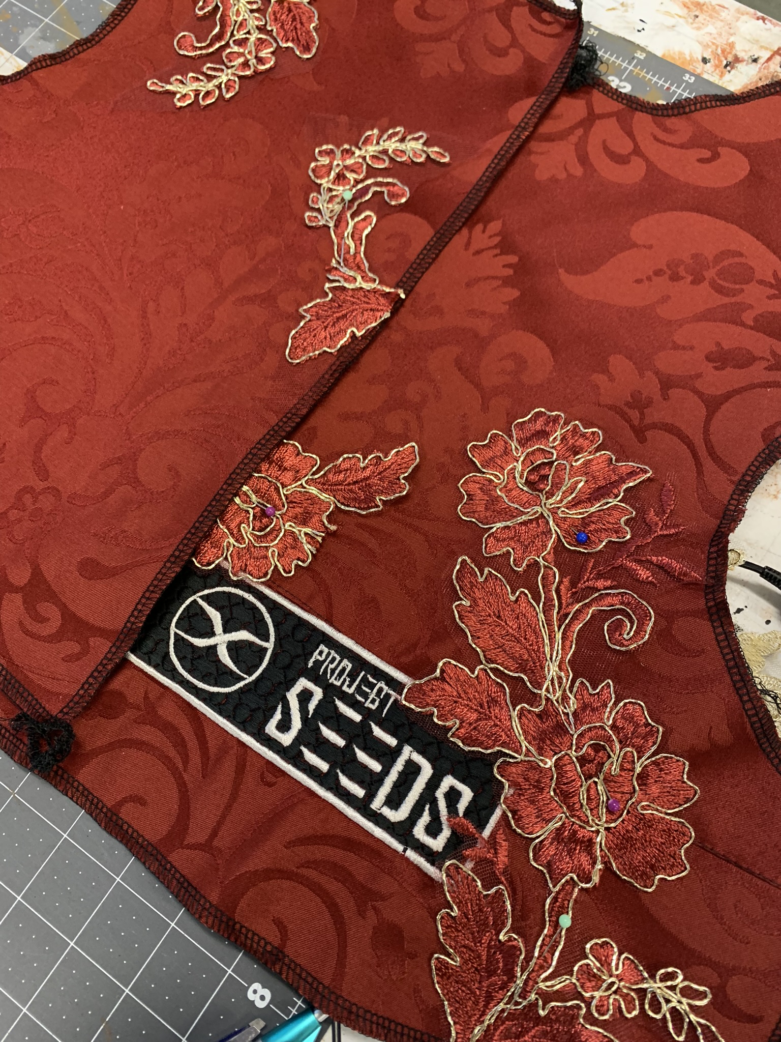 I’ll mark with pins where I want to make the divisions in the material. I sleep on those ideas and cut them out the next day. I always make revisions from my first ideas. I will pin my newly cut pieces on the jacket and again, sleep on it. Sometimes for the layout it can take me up to 3 days to finally decide on a design. When I feel happy enough with how it looks, I hand-stitch everything down while listening to a good audio book!
