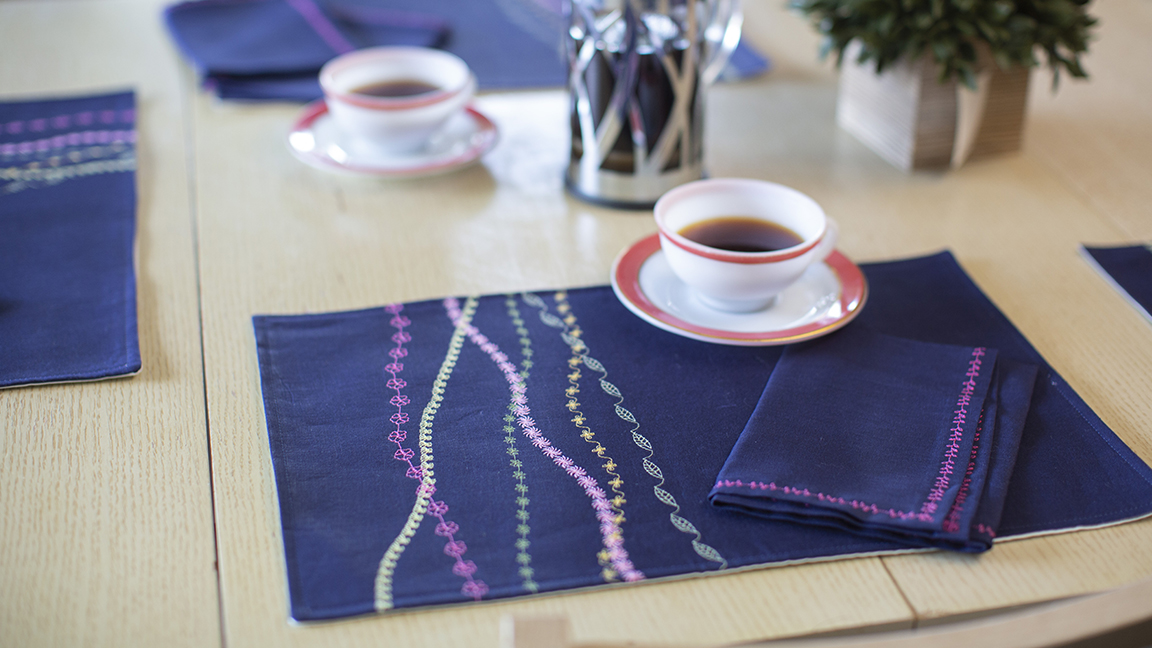Spruce up your dining room with these fun custom embroidered placemats and matching napkins. Use a variety of colors and decorative stitches to make this unique project. Placemat size: 12" x 18" Napkin size: 18" square
