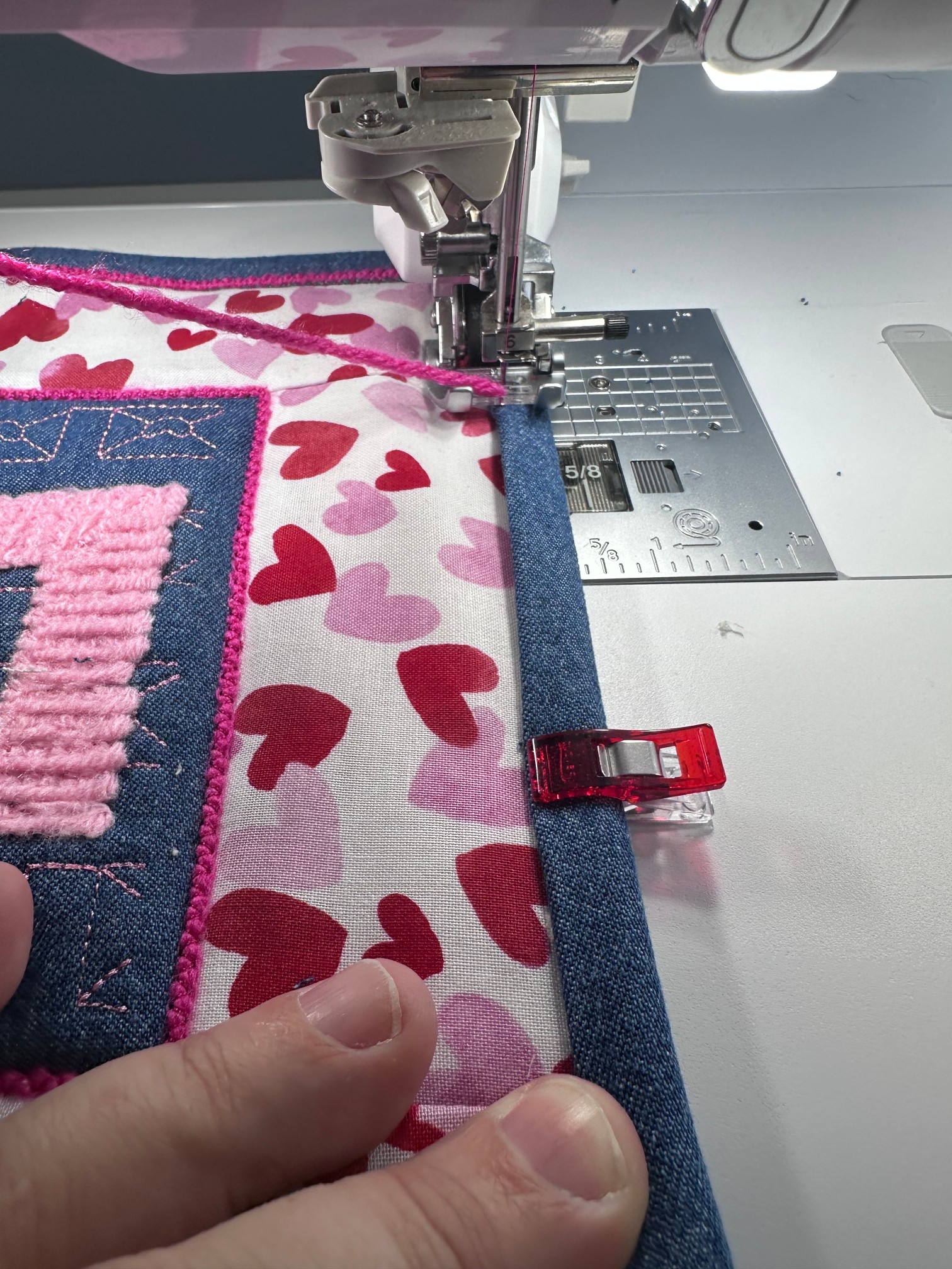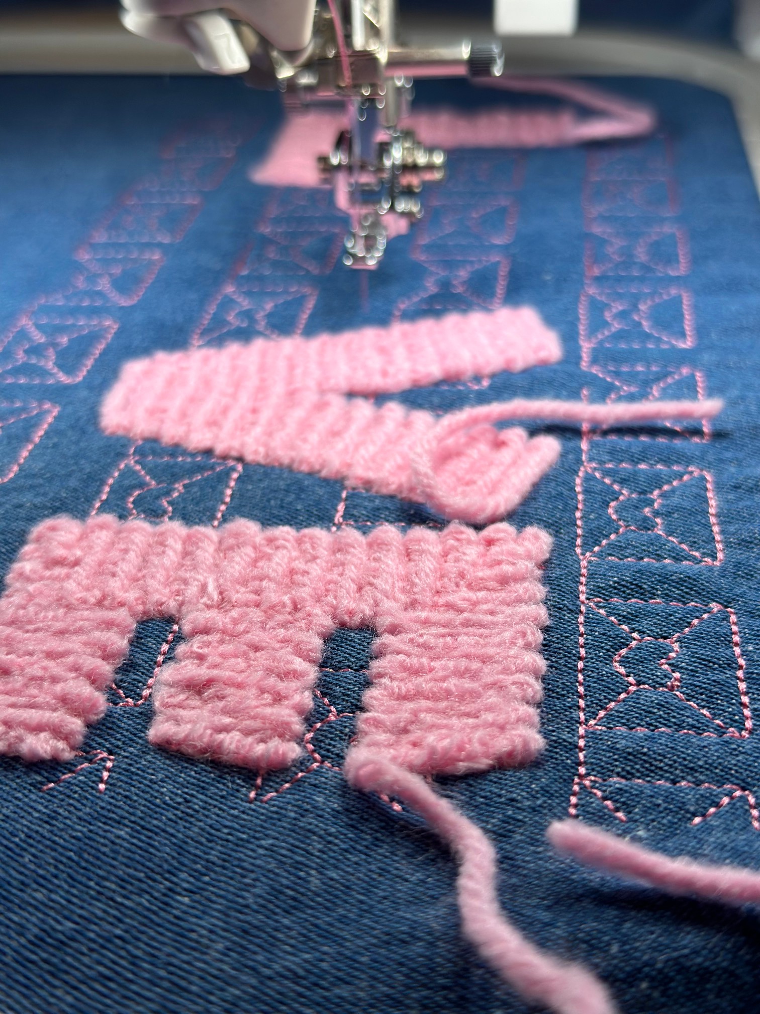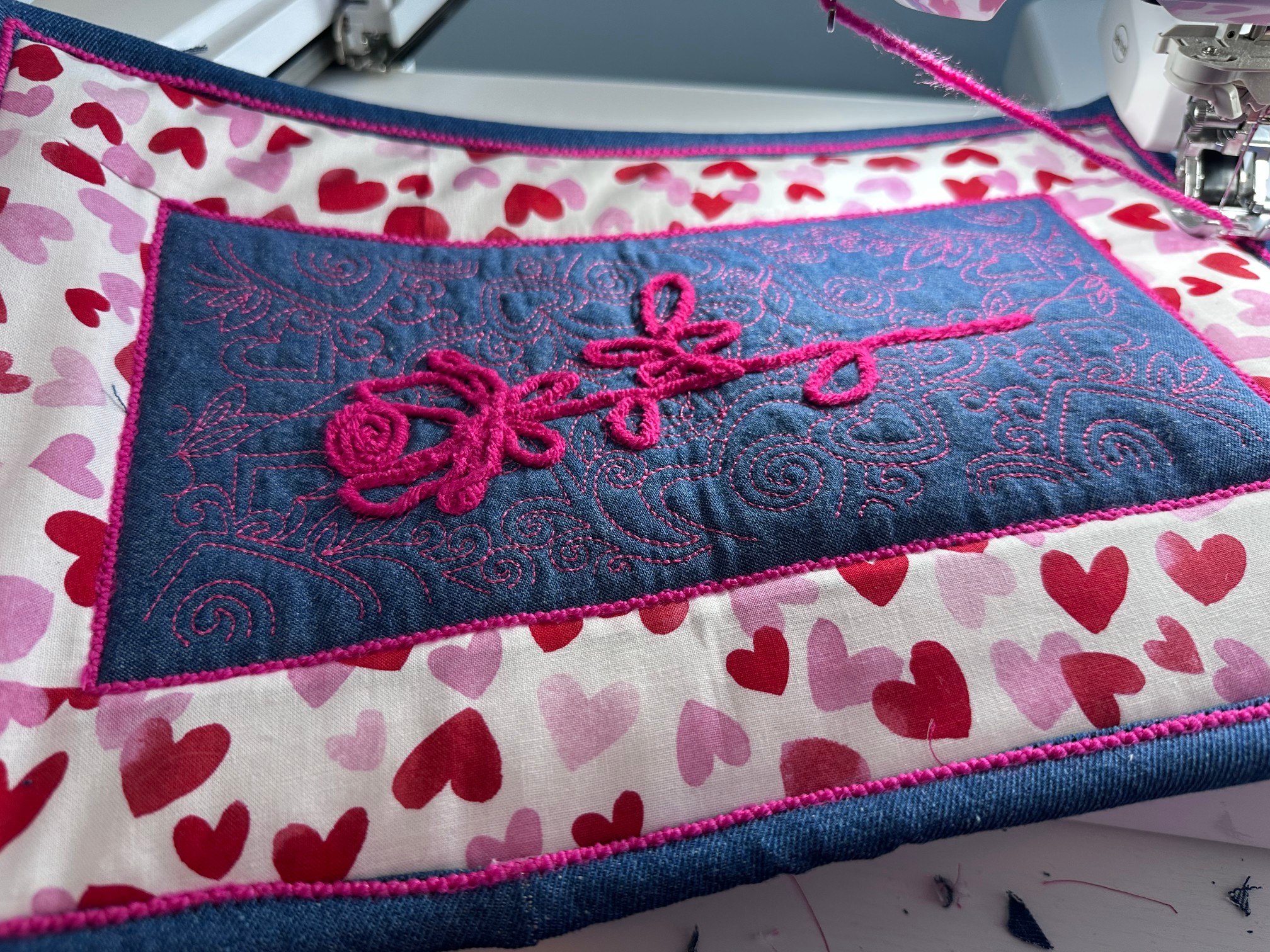 20. Once again, the Digital Dual Feed Foot and Yarn Couching Sole was used to attach the binding while also adding coordinating yarn.