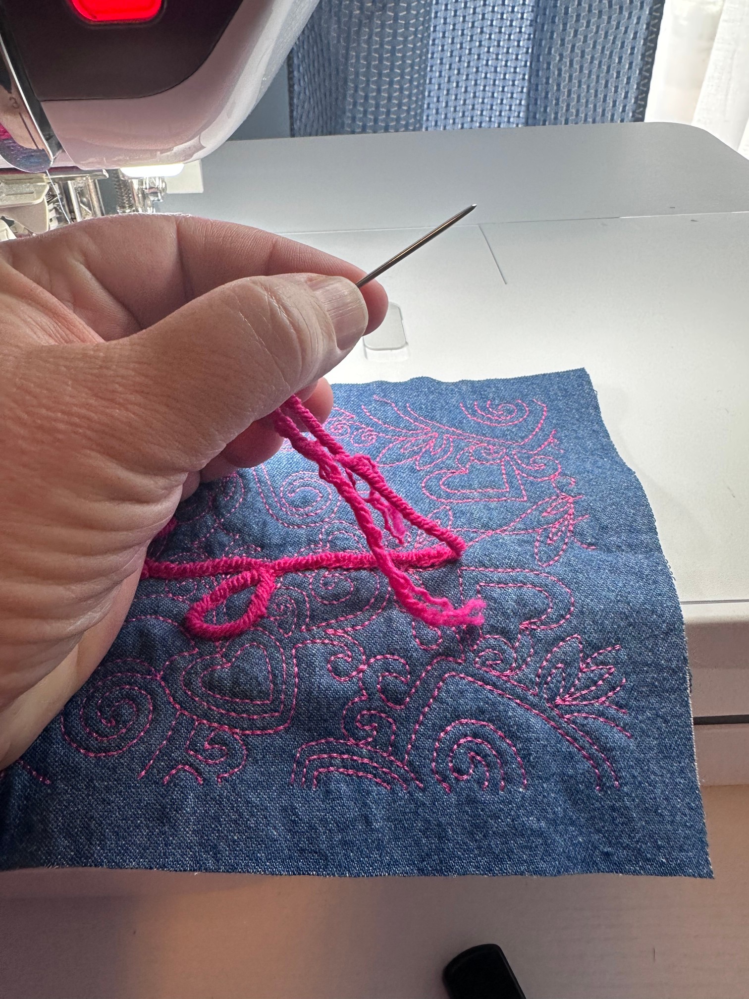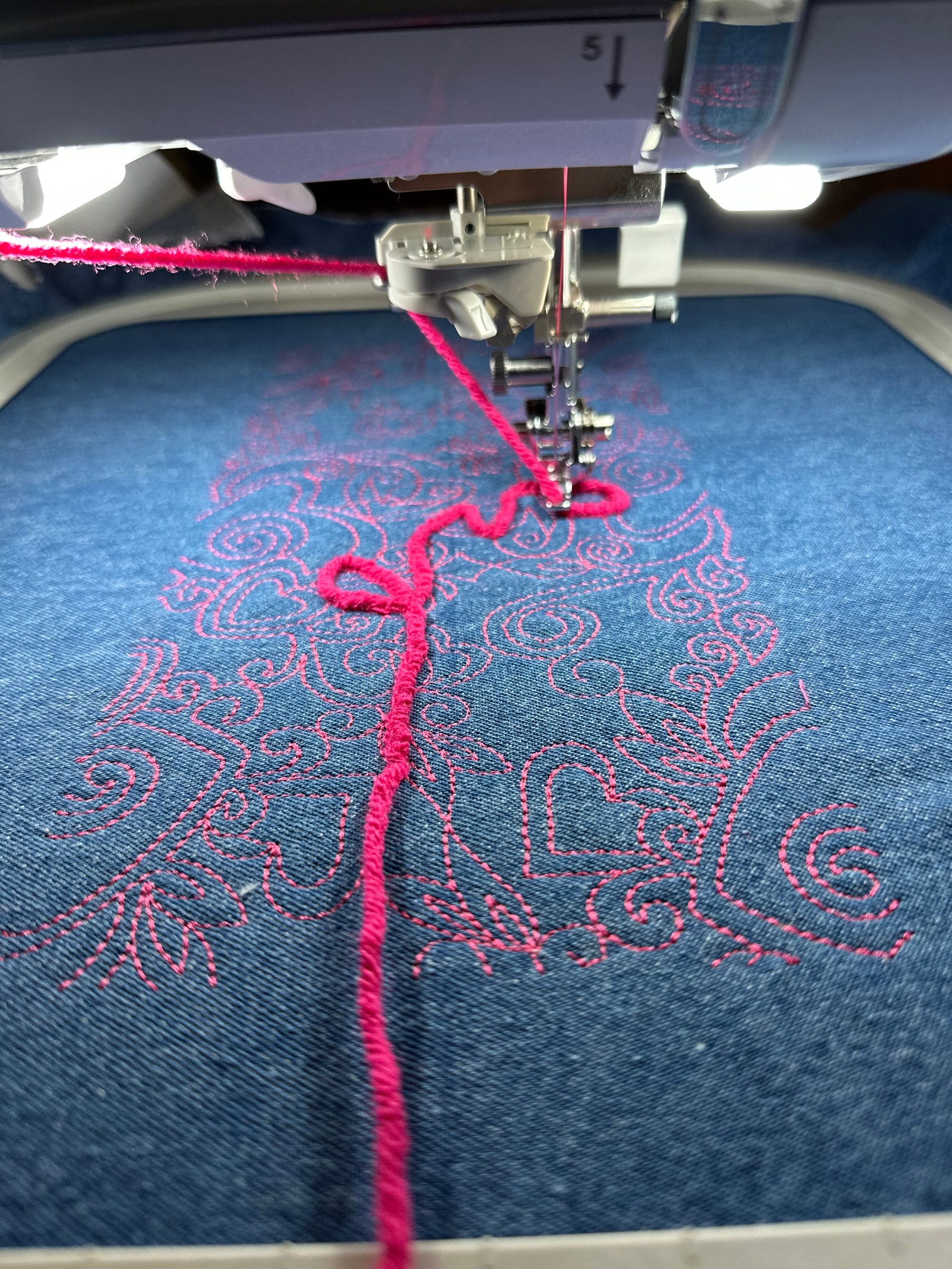 9. Pull the yarn/cording to the front of the foot and adjust the stitching while visually auditioning them.