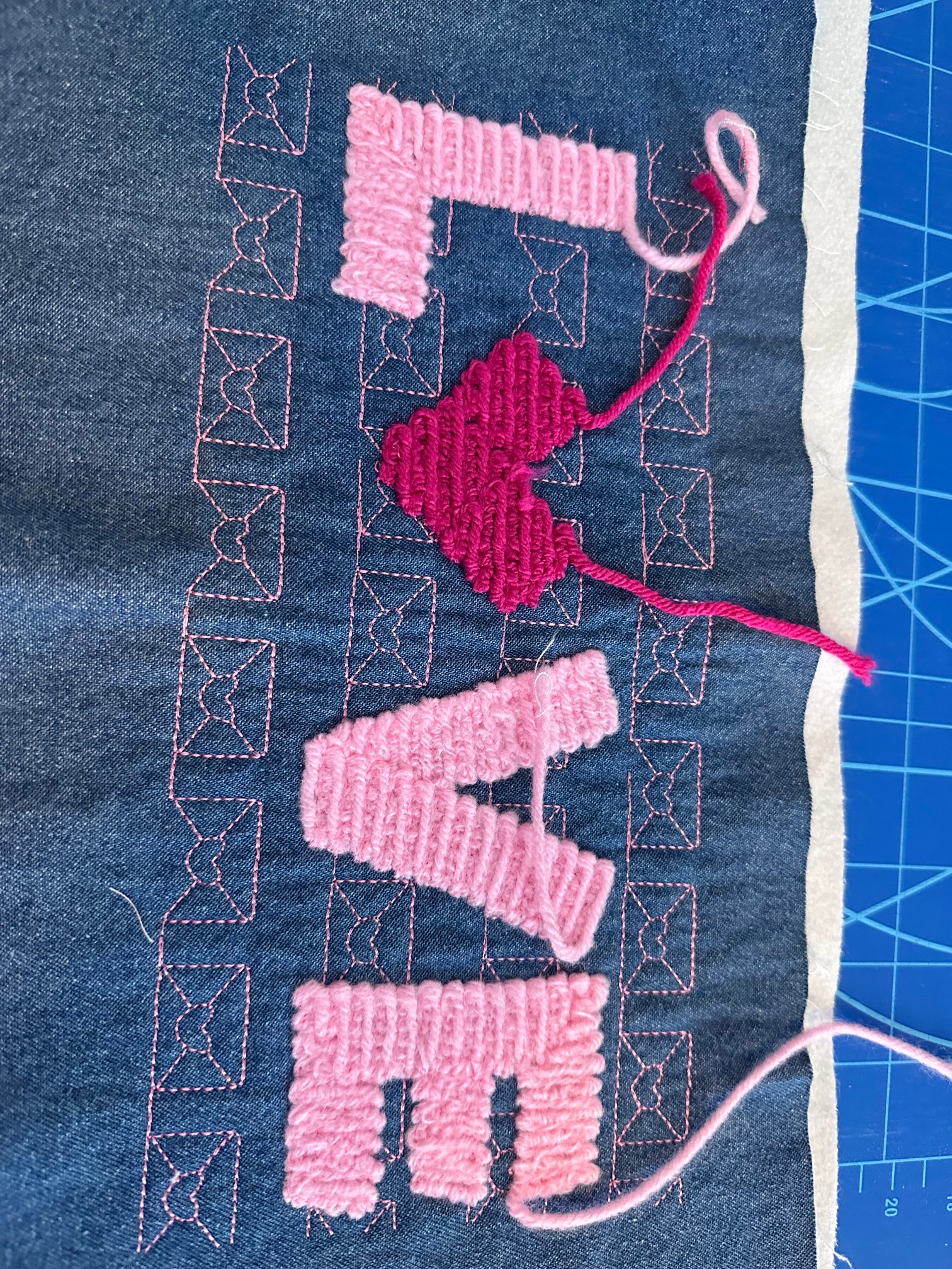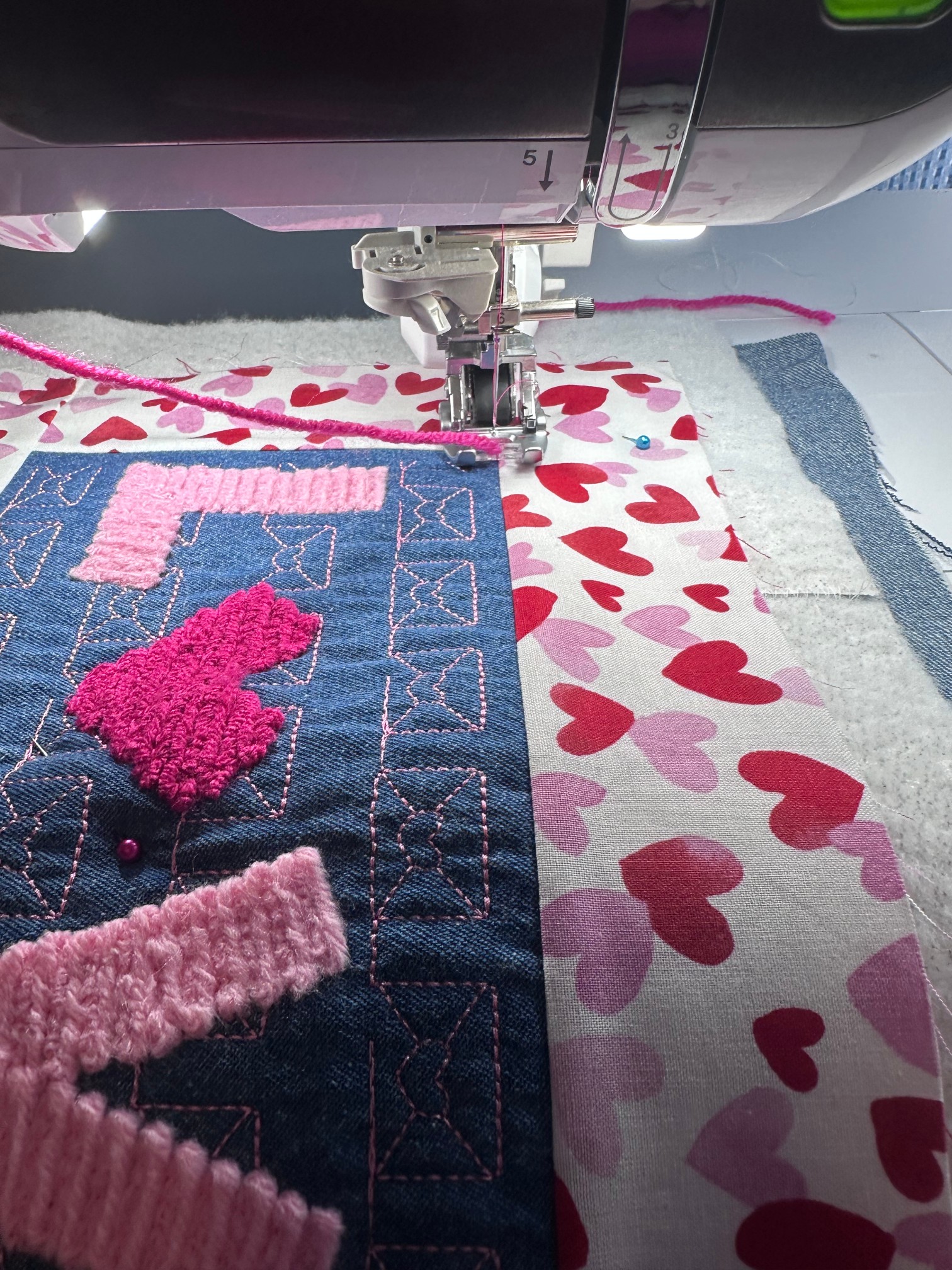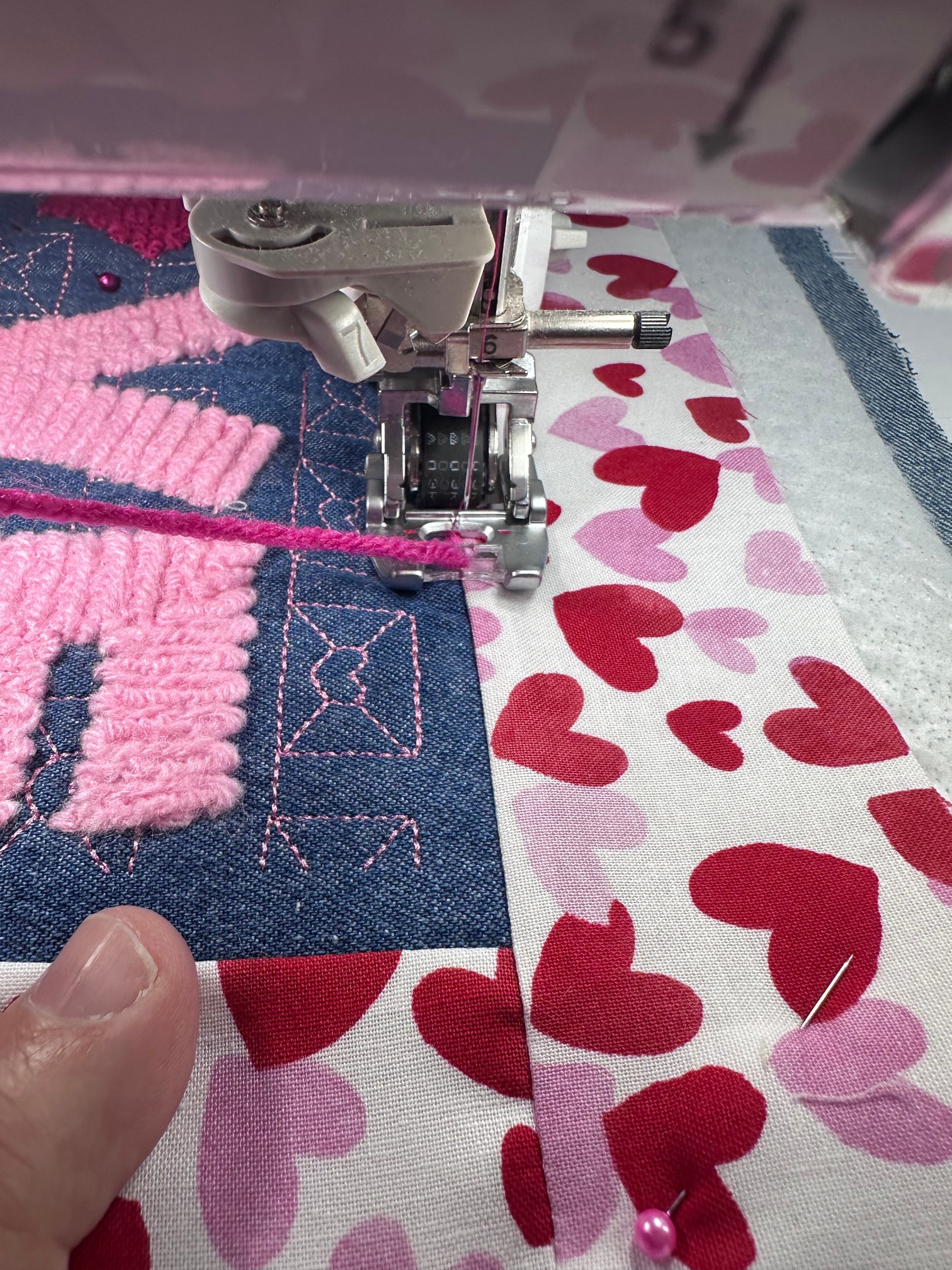 14. For this project, the seam around the stitched denim piece and the sashing was stitched with a coordinating yarn.