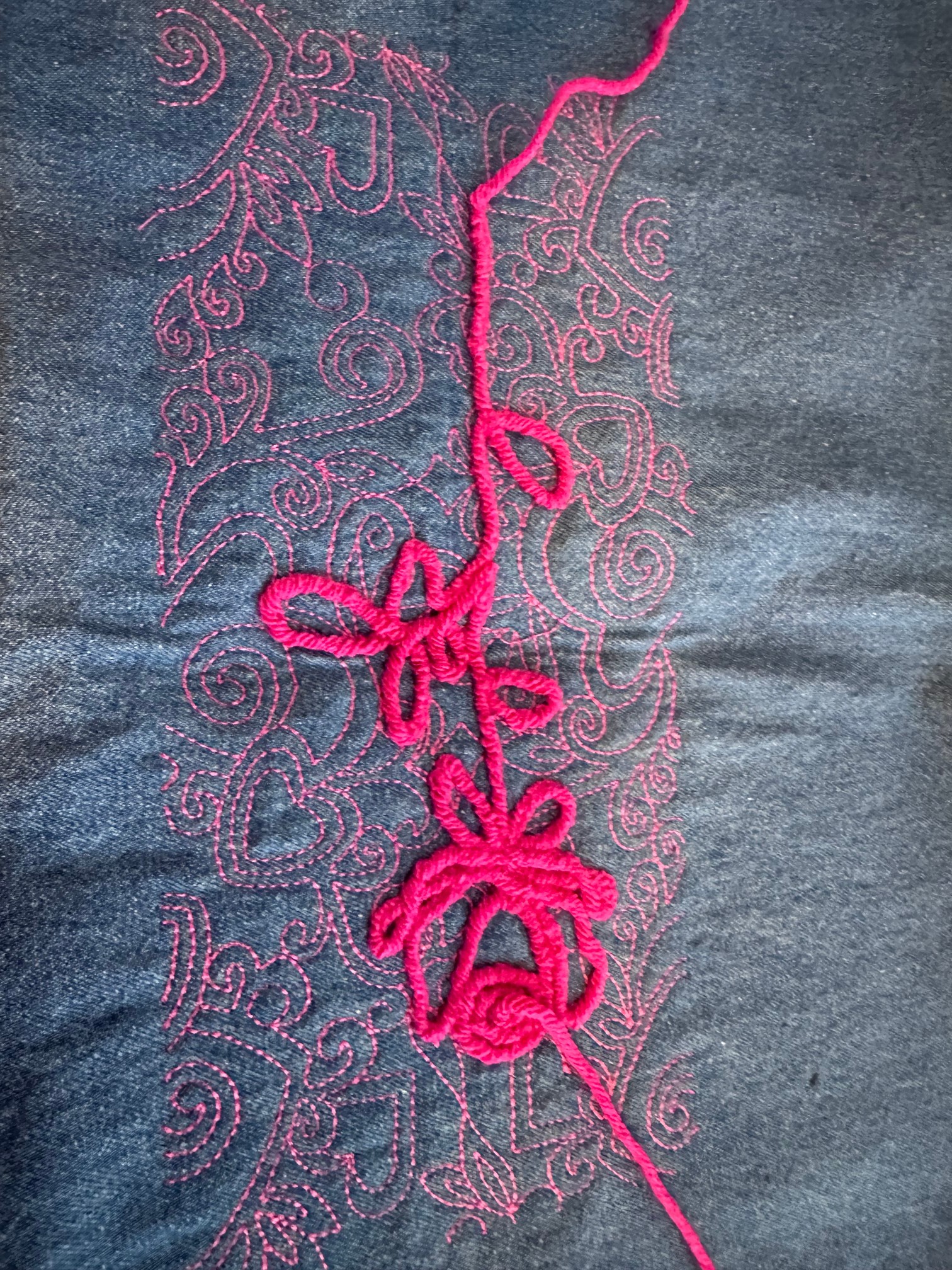 11. One done stitching, remove from the hoop, trim 1” around the stitched edge of the decorative fill and pull the thread tails to the back of the denim fabric.