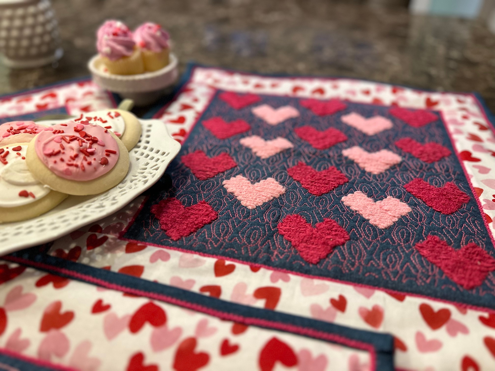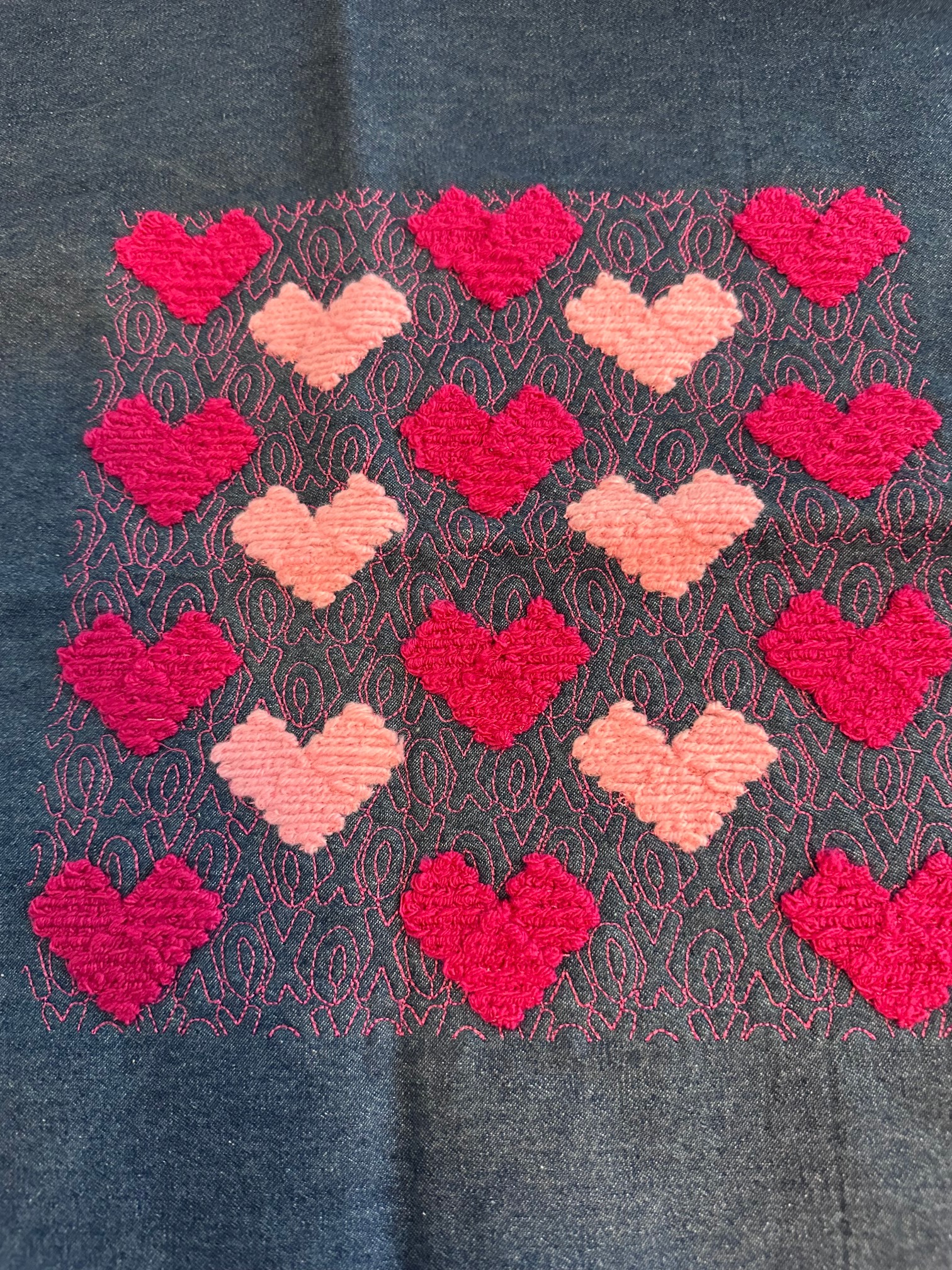 - Repeated Heart design – The same Heart design created using the period is grouped, saved, and repeated using the Border/Repeat key to create an overall heart look. Two different color yarns were used for this project.
