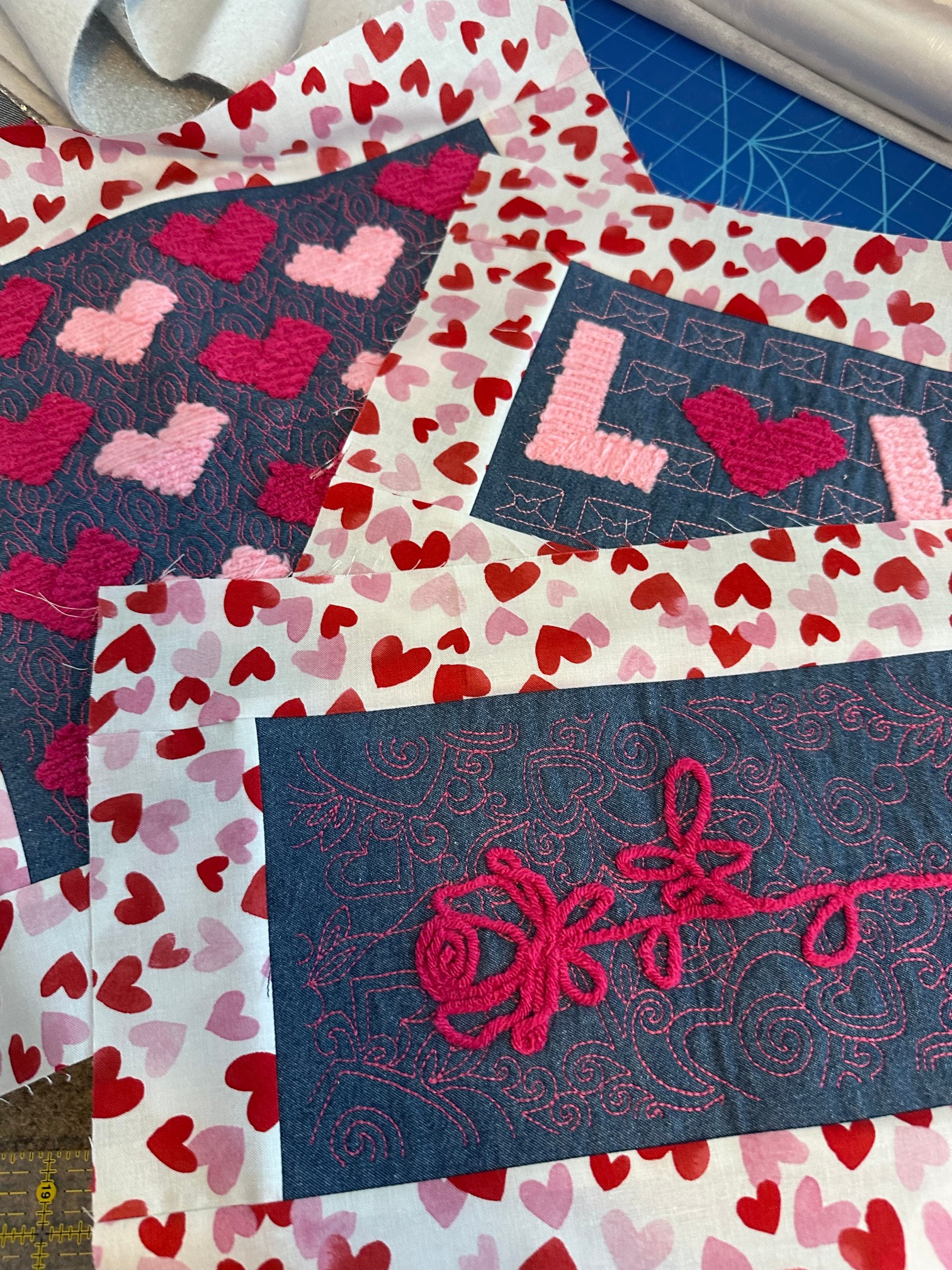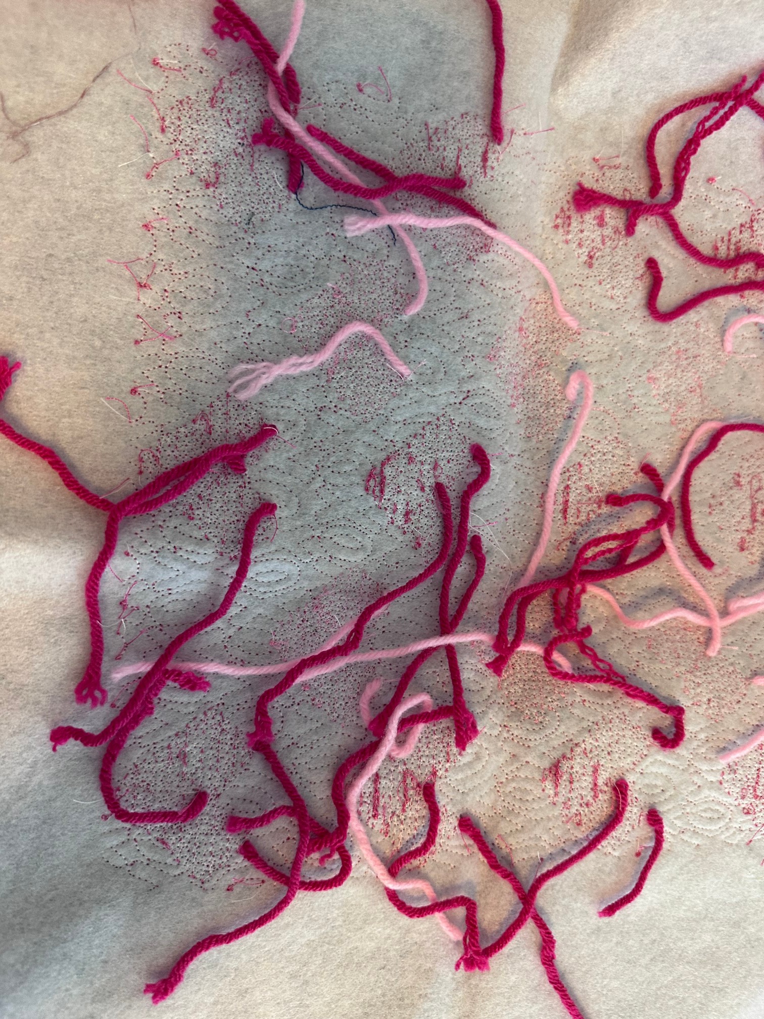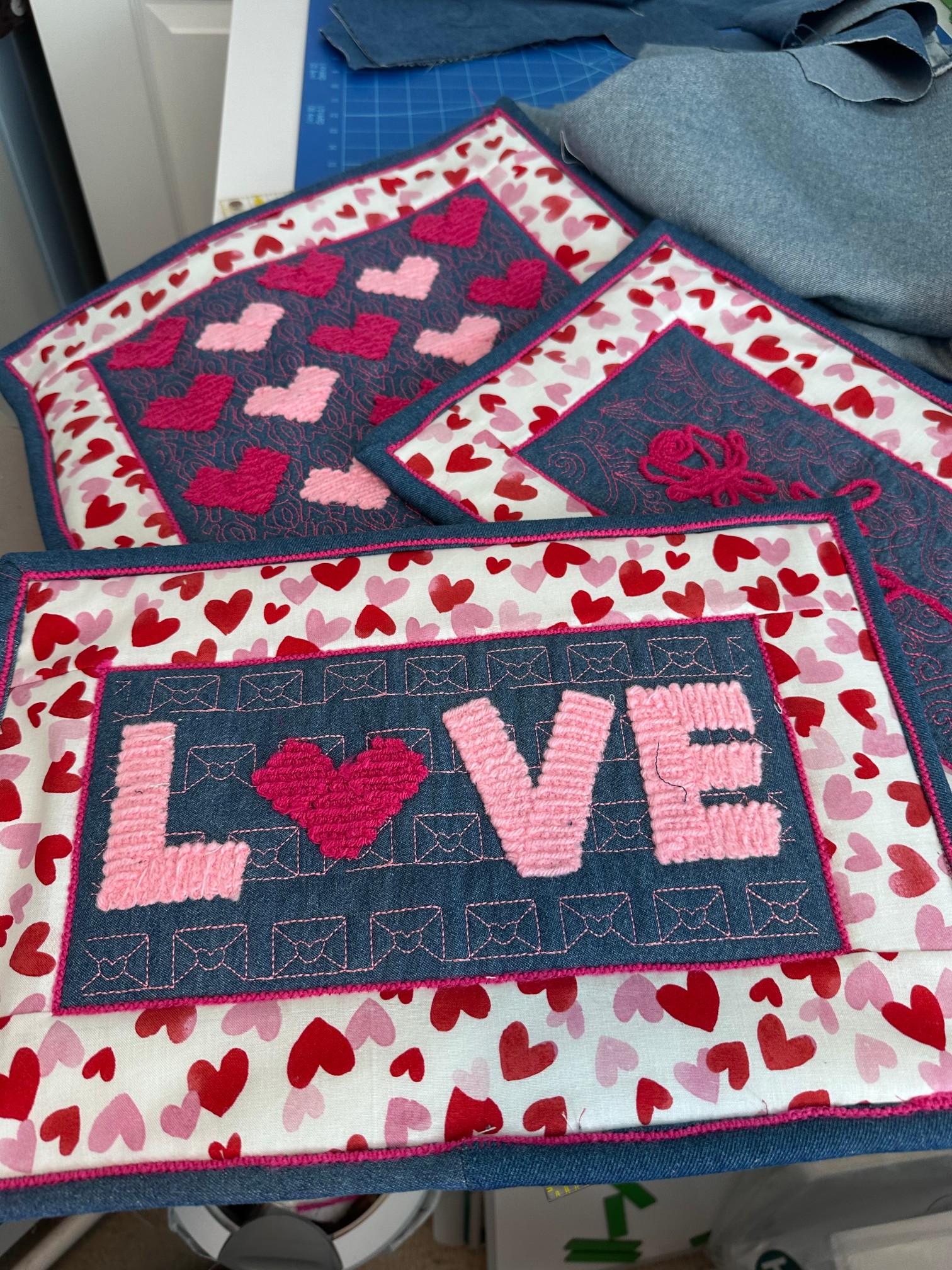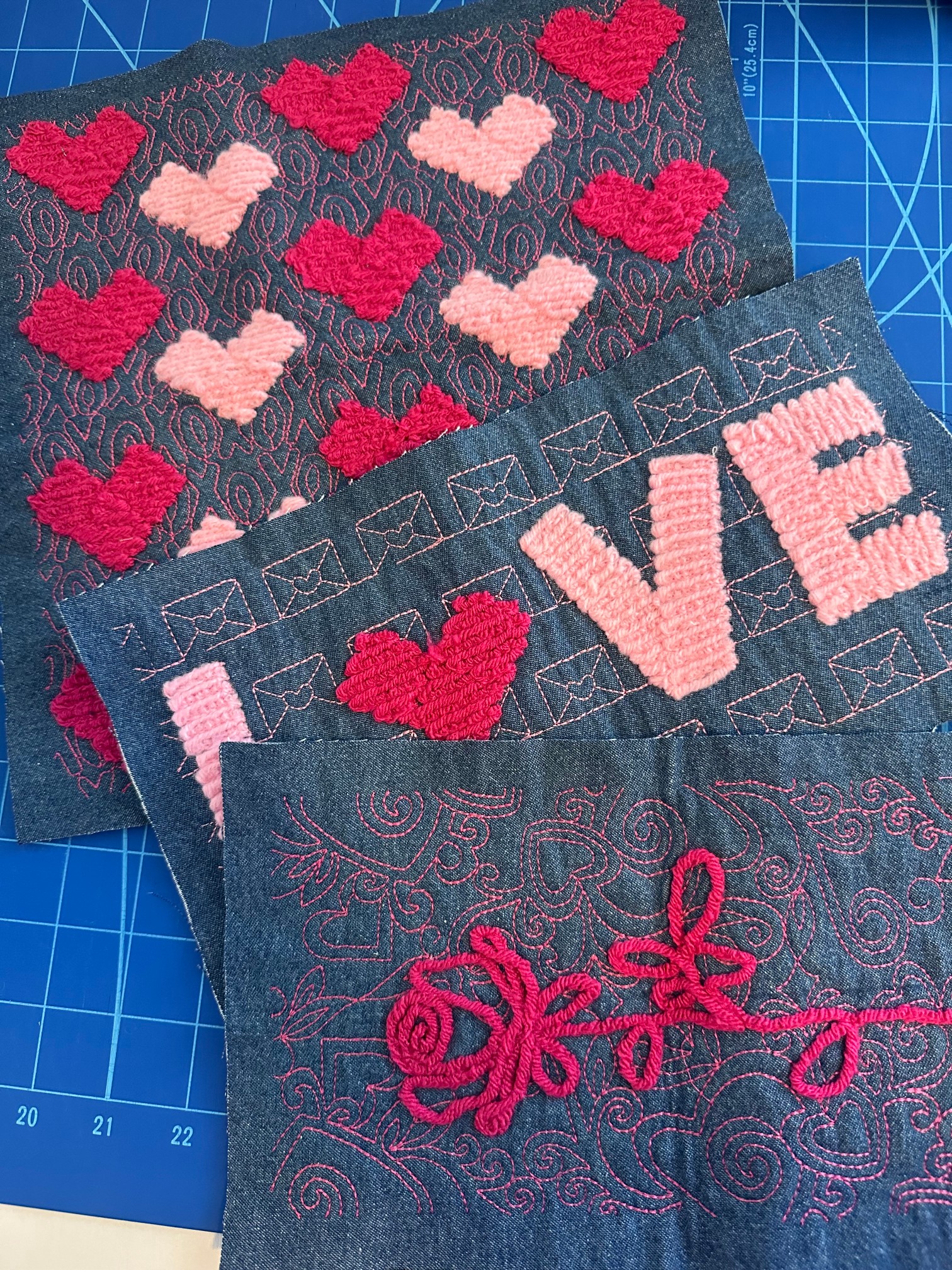For this project, three hot pads were created. Each block had a background fill stitched prior to adding the yarn couching designs.