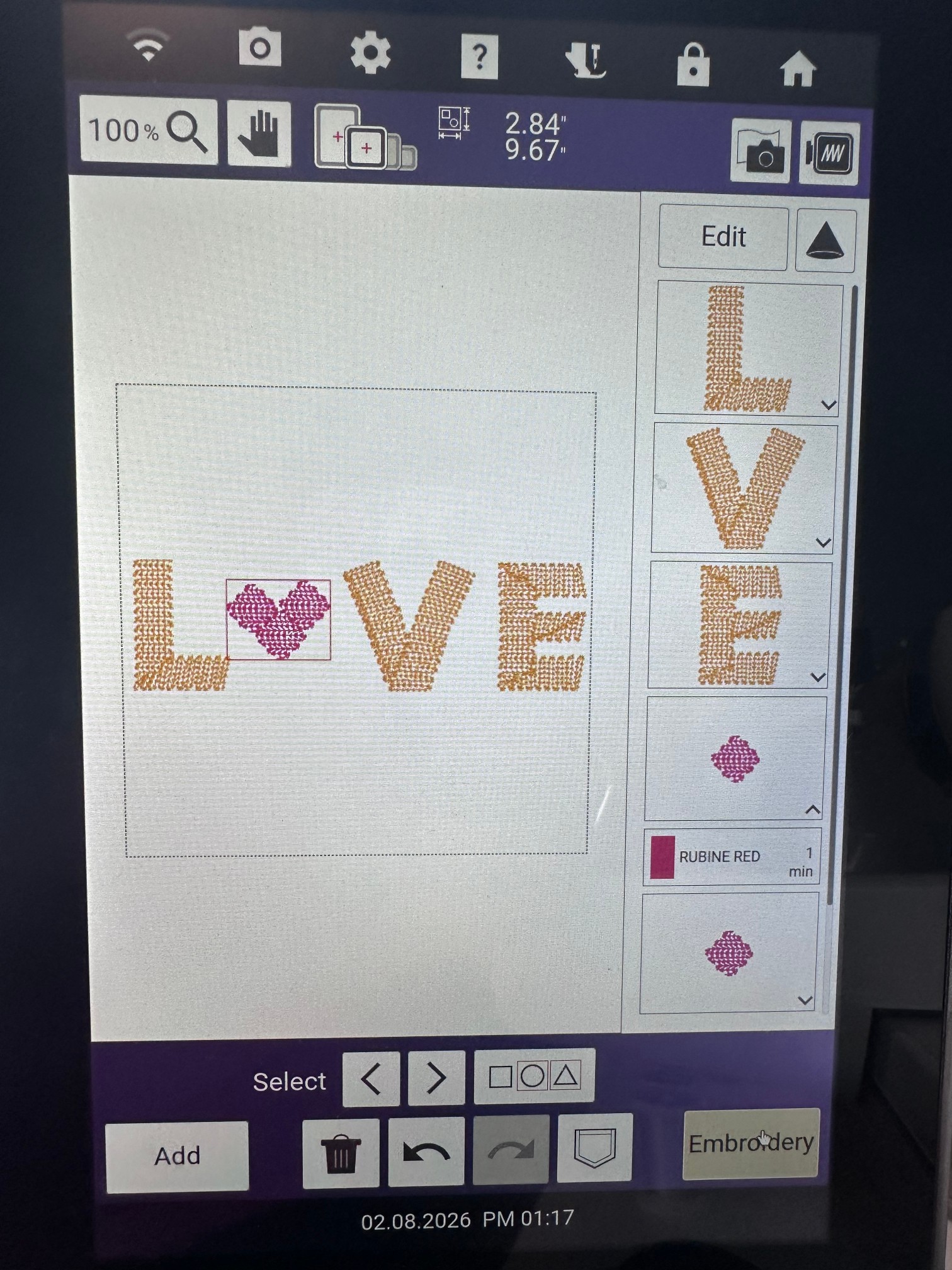 12. All the letters will be placed in the center of the hoop. Use the Move and Alignment Keys to line of the letters into the word LOVE.