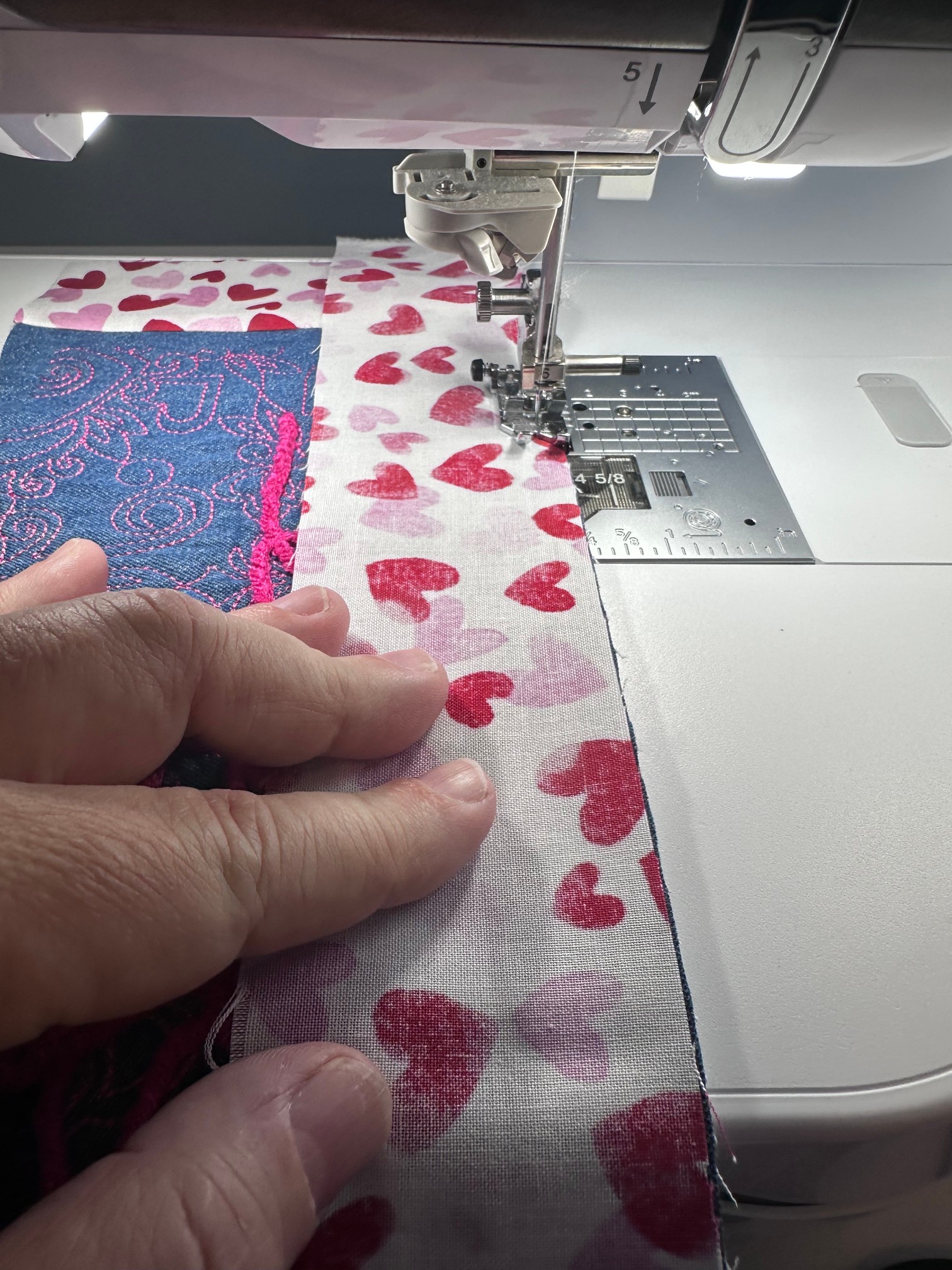 2. Using the trimmed pieces, attach the strips to the sides and top/bottom of the denim pieces using a ¼” piecing foot. Use stitch 1-03 or Q-01