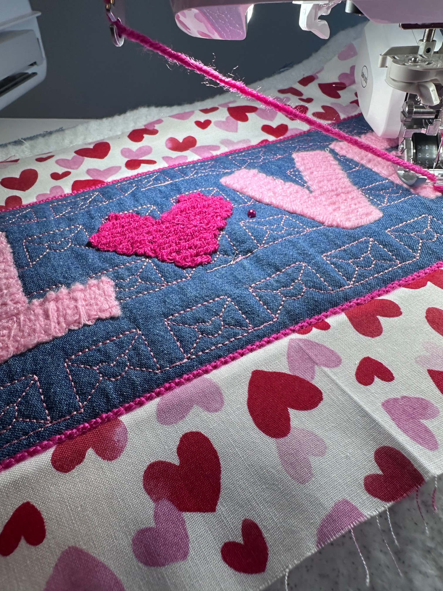 The Baby Lock Radiance, Solaris Vision, Altair 2, and Meridian 2 include built-in yarn couching designs. Use these letters and designs to create fun stitch outs that can be turned into hot pads. Think of using them as shapes, and your world will open to how you can use these designs to create more of a punch needle embroidery look for your embroidery projects.