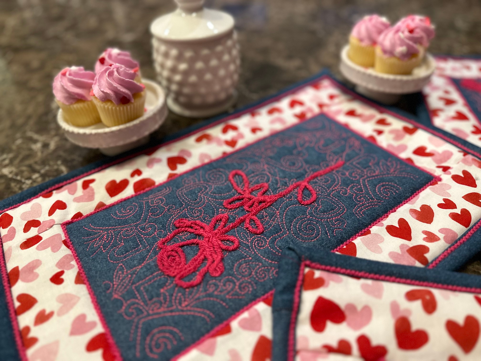 These designs could be used in a multitude of ways. After stitching these out, the thought of turning them into a hot pad seemed like a fun way to use yarn couching. Many people crochet hot pads, so the texture of the yarn couching designs is similar. Adding some additional yarn texture using the Digital Dual Feed foot and the couching, seemed like a good way to level the hot pad and provide some additional support. It also looks kind of cool!