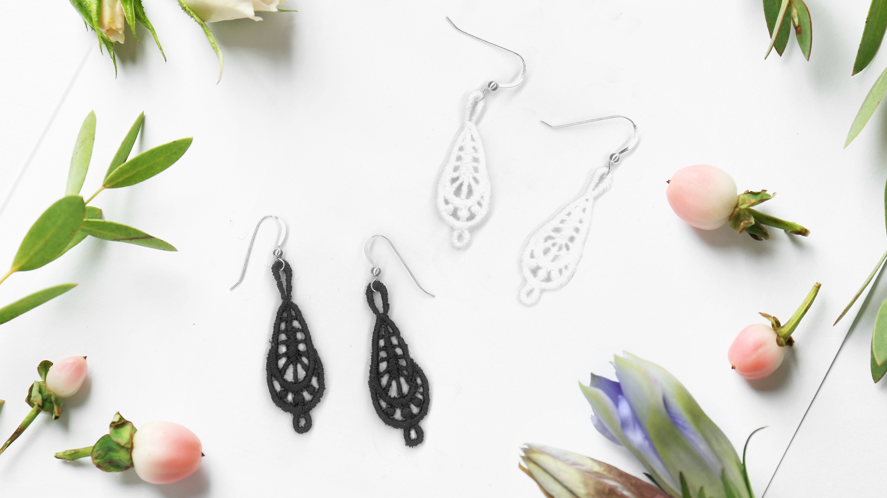 Finally insert the loop of the stitched-out lace onto an earring hook. Repeat with the second earring. Add gems or beads if desired.