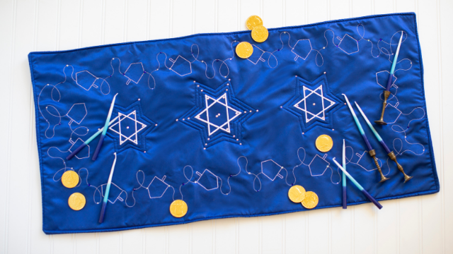 Celebrate Hanukkah by creating a fun embroidered table runner that is a perfect addition to a dinner party.