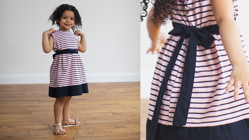Create this simple little girl’s knit dress with contrasting band hem and sash using your Baby Lock serger.
