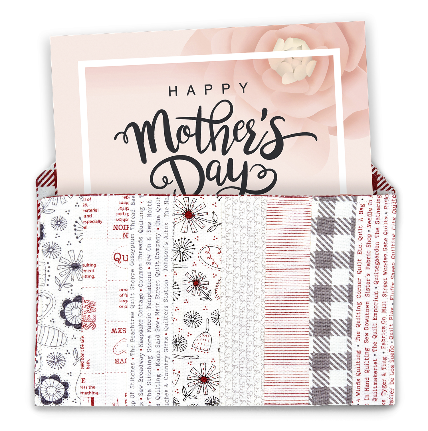 Make a fabric card envelope for mom out of eight coordinating fat quarter fabrics. She'll love the homemade touch of this envelope! Using a red white and black color scheme we made this unique and easily personalized envelope to hold a card and can be recycled to carry coupons or notes. This quick and easy sewing and quilting project can be made and adapted for a birthday Valentine’s Day sympathy congratulations birth or any other occasion for a loved one! Download printable instructions here.