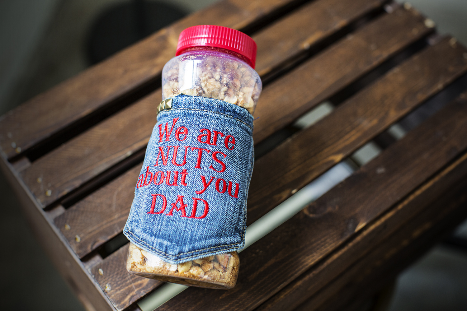 Is your dad nuts about nuts? Create this simple gift from a pair of denim jeans and place it around a jar of your father’s favorite type of nut. You can upcycle the back pocket of the pants and embroider it using Designers Gallery FontWorks software. Dad is sure to love this unique and personalized gift! Download printable instructions.