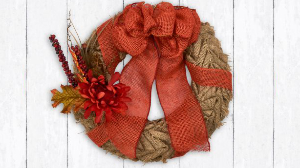 Wrap a section of the orange burlap around the wreath and decorate with any floral sprig.