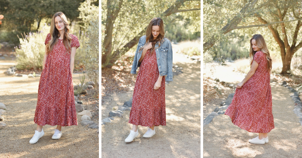 I used this gorgeous red and white floral rayon dead stock fabric I bought in LA maybe two years ago. I’ve been saving it for just the right project. My baby is due very early fall so I know I needed something light and breezy but that will have room to grow that will last through the whole summer. I used just under 4 yards of fabric.