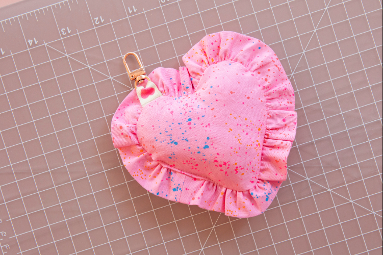 Open a small woven label and slide the circle side of a metal lobster clasp through the label. Pin the label on the top right side of one of the heart pieces. The metal clasp will be towards the inside of the heart shape. Baste in place, keeping in mind a 1/4″ seam allowance.