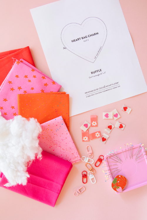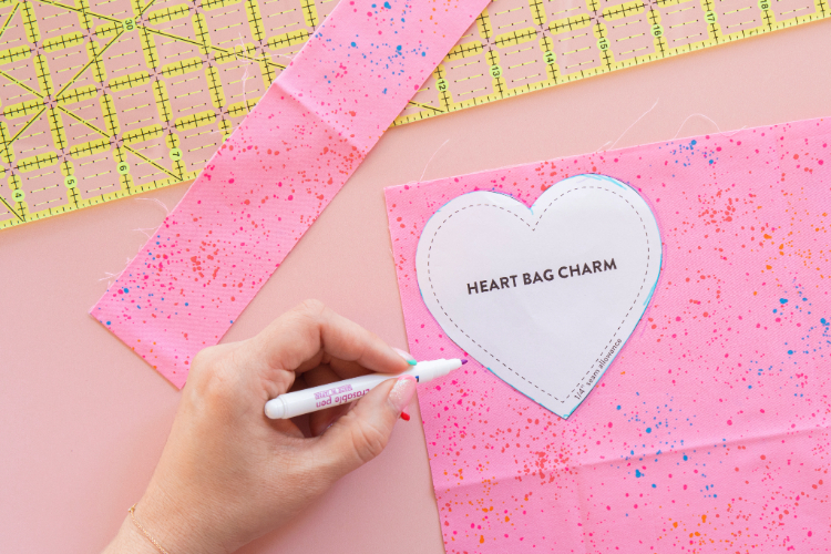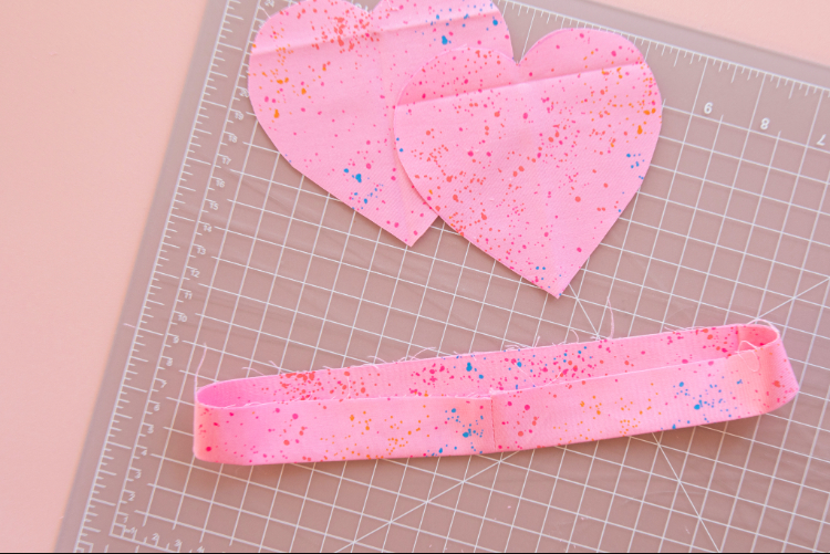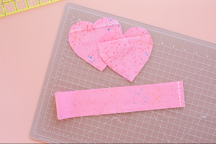 Fold the remaining fabric in half, right sides together. Place the heart pattern on the fabric and trace with chalk or a fabric marker. Cut out the heart shapes. You will have one long strip of fabric and 2 heart shape pieces.