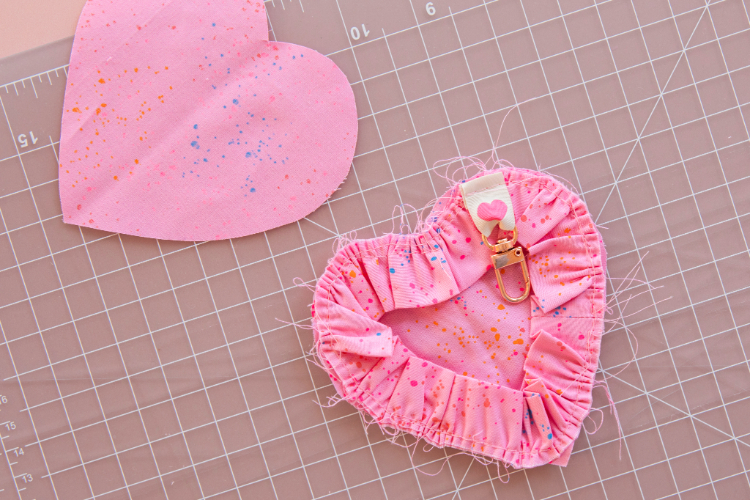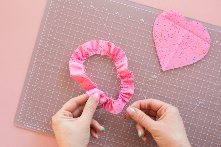 Place one heart fabric piece right side up. Align the raw edges of ruffle and the outer edge of the heart fabric. Pin in place and adjust the gathers as needed. Baste about 1/8″ from the edge all the way around the hole the ruffle