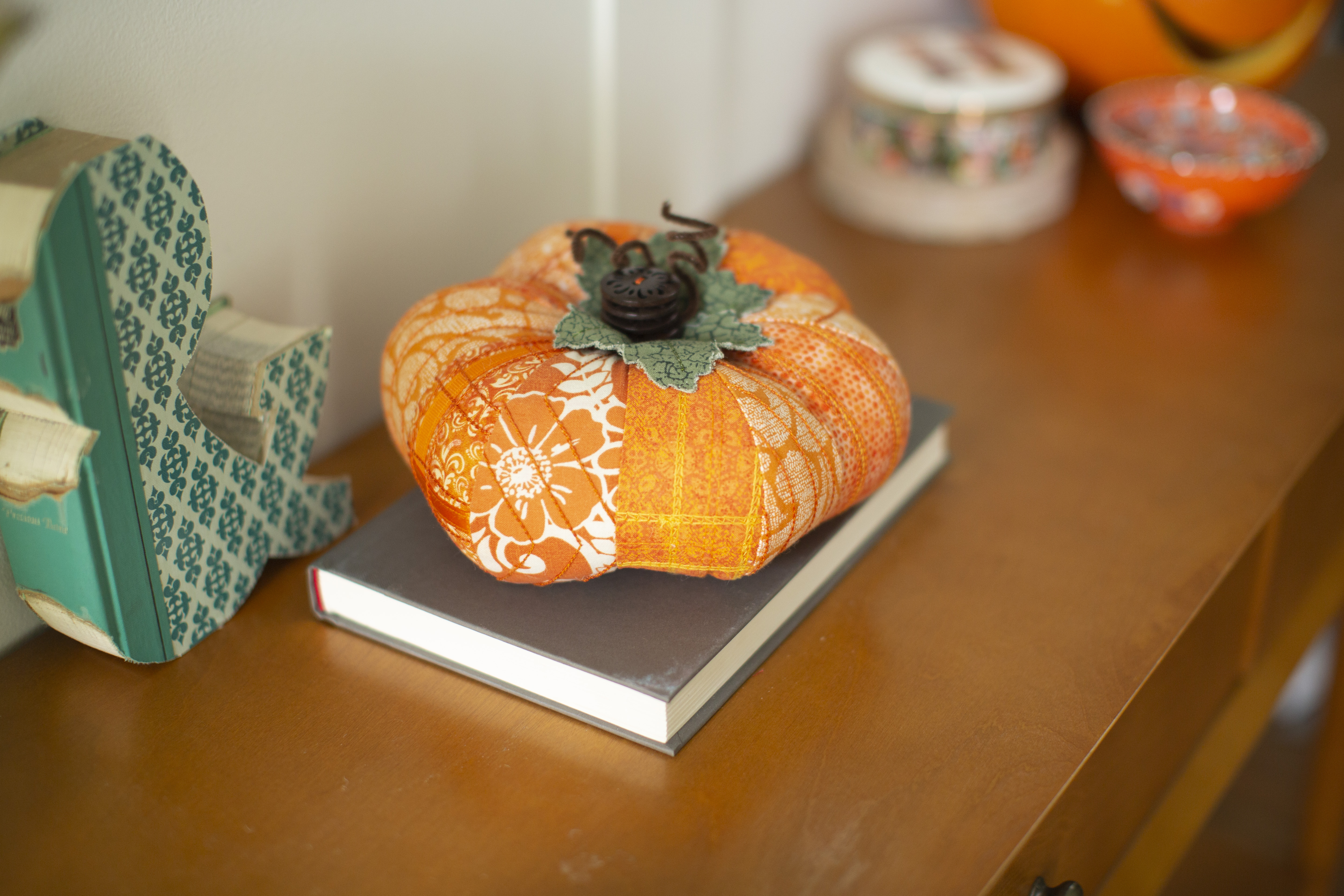 Using a heavy weight thread and decorative buttons create the “stem” of the pumpkin by threading the buttons onto the thread and sewing through the center of the pumpkin.
