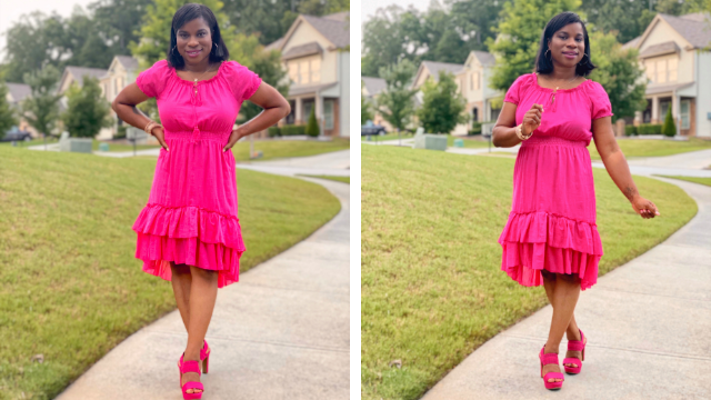 As you can see in the photo above the original dress is a maxi dress with two tiers of ruffles. On the hanger the dress looked nice but once I put it on I felt that the placement of the second tier of ruffles looked odd on my shape. Has that ever happened to you before? I decided to cut the dress to the length of the first tier of ruffles (I love that there is a high-low design to the ruffles) leaving enough excess fabric for the seam allowance. I then removed the ruffle from the lower half of the dress. Once I removed the second tier of the ruffle I pinned it to the excess fabric I spoke of above that I left for seam allowance. Lastly I took the dress to my Baby Lock Presto 2 sewing machine and stitched everything together.