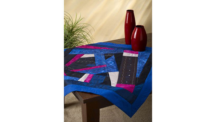 Create an easy modern and festive table topper to give your dining or entry table a little bit of shine! This crazy patch project really pops with decorative bobbin work and crystals. Download printable instructions.