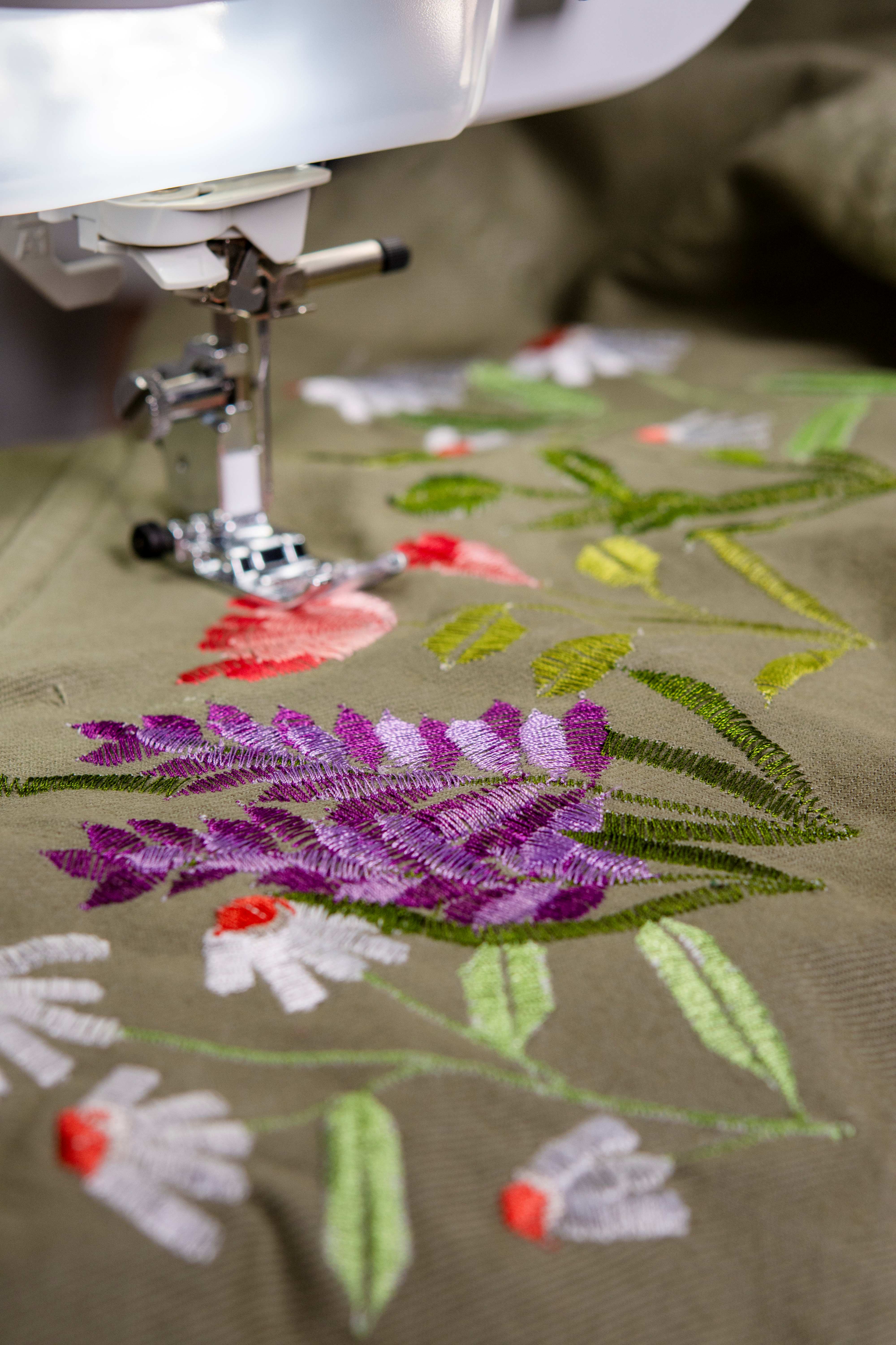 No specific preparation is required for this project; however, you may find using a fabric chalk marking pen (or equivalent) to create a general “road map” for where you want specific flower embellishments can be helpful. Practice stitching is also highly recommended. By testing your stitches ahead of time, you can test a wide variety of stitch settings to ensure you achieve the desired results. Practice stitching should be done on a similar weight and type of fabric to that of the actual garment being used. If variations of thread types and weights are being introduced, testing each thread can also be useful.