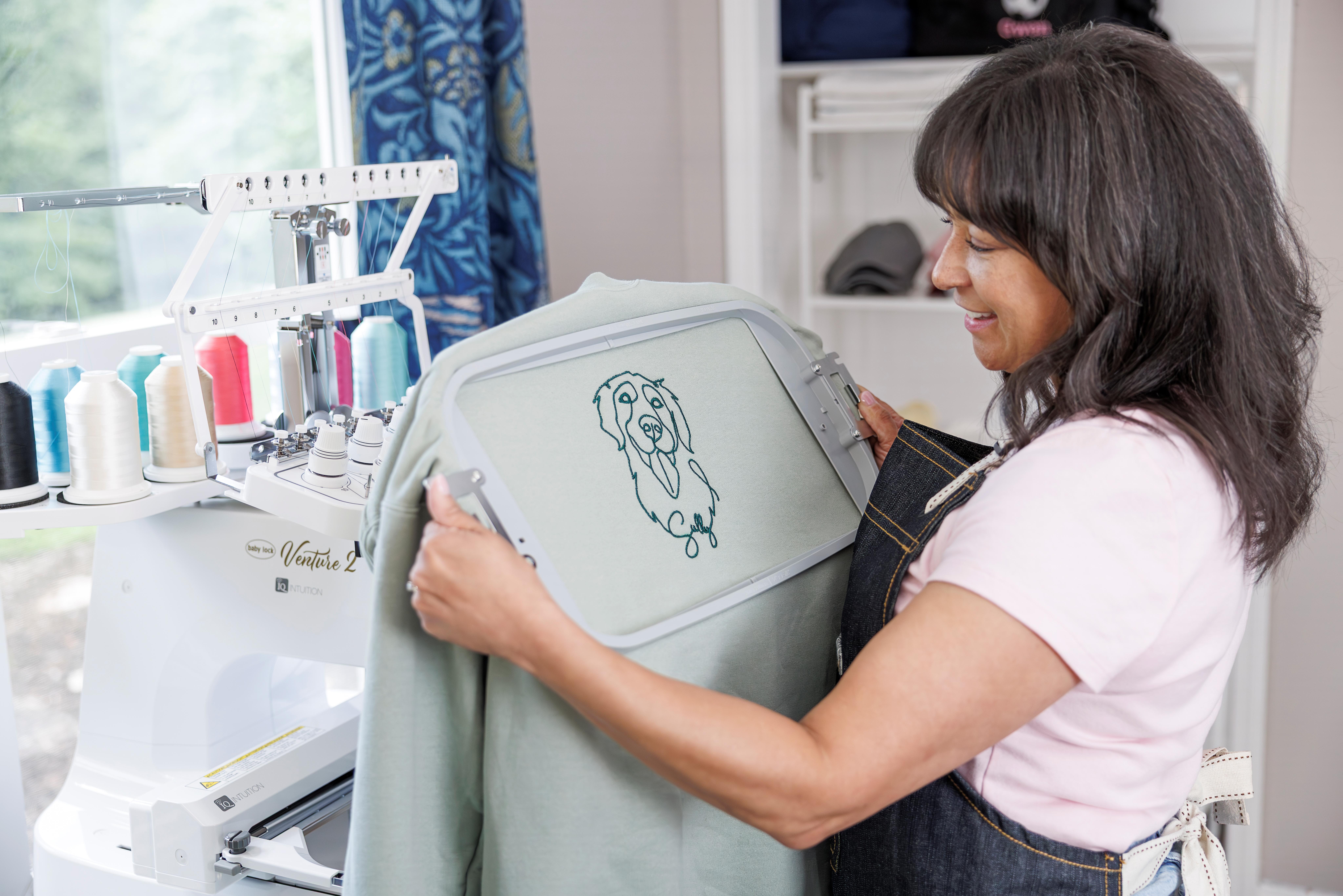 Use the Baby Lock Venture 2 to take something blank to bountiful! Showcase your favorite artwork by turning it into a design all using the built in IQ Designer program. This project showcases an outline artwork created for Sully the Golden. Scanning or importing artwork, assign your line and fill properties and create your own unique embroidery creations!